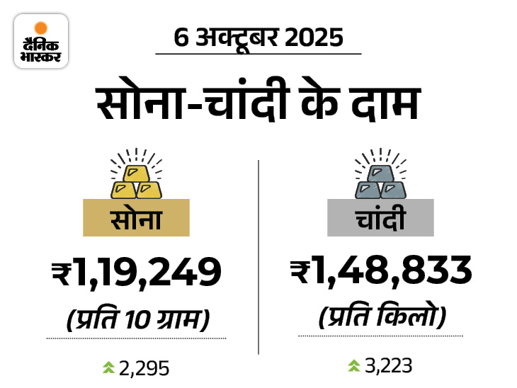 सोने-चांदी के दाम आज यानी 6 अक्टूबर को एक बार फिर ऑलटाइम हाई पर पहुंच गए। इंडिया बुलियन एंड ज्वेलर्स एसोसिएशन (IBJA) के अनुसार 10 ग्राम 24 कैरेट सोना 2,295 रुपए बढ़कर 1,19,249 रुपए पर पहुंच गया। इससे पहले ये 1,16,954 रुपए पर था।